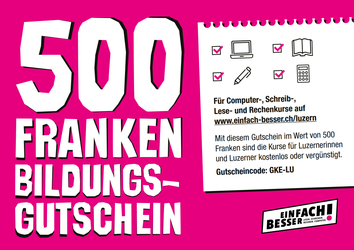 - Die Kursteilnehmenden müssen mindestens 60% des Kurses besuchen damit der Gutschein gültig ist. Werden weniger als 60% des Kurses besucht, müssen die Kursteilnehmenden den Kurs selbst bezahlen.